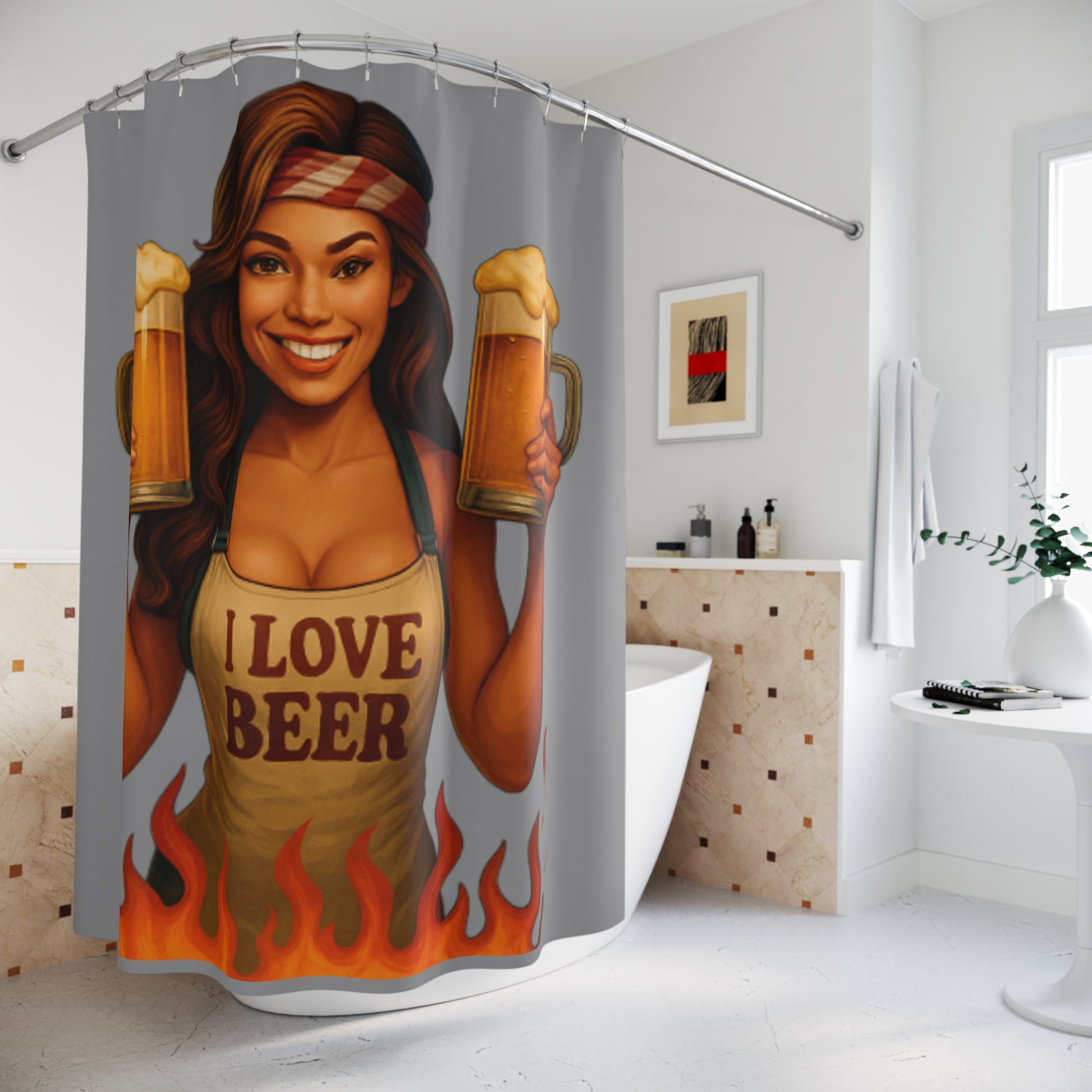 This shower curtain is here to add an original touch to any bathroom with your designs. Made with highly durable polyester, this curtain stays like new for a long time to come and is a perfect printing area for your art. Please note: While polyester offers adequate protection against water, a liner might be necessary for full waterproofness.